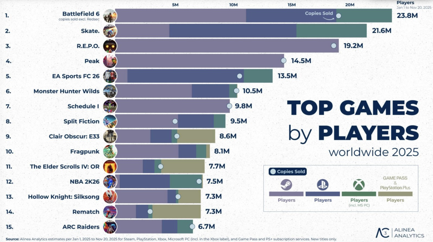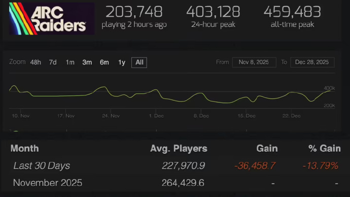 竞核12月29日消息,《Arc Raiders》玩家巅峰留存率高达86%:今年《Arc Raiders》已成为本年度最亮眼的多人联机游戏,尤为亮眼的是,这款撤离射击游戏在玩家峰值逼近 46 万人后,仍保持着 86% 的玩家留存率。