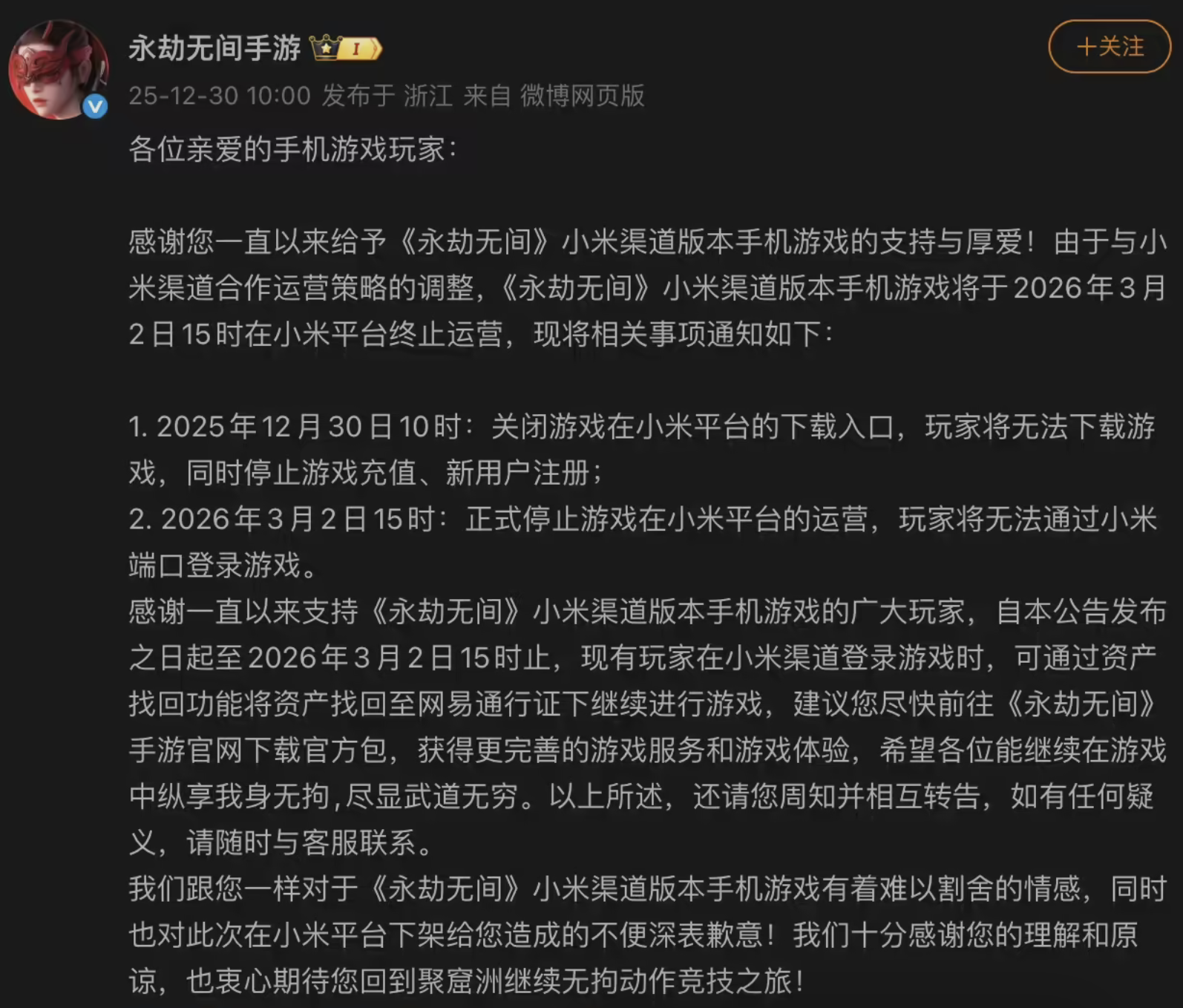 竞核12月30日消息,《永劫无间》手游小米渠道服将于明年3月停运:今日,《永劫无间》手游官方微博发布公告,因与小米渠道合作运营策略调整,小米渠道版本将于 2026 年 3 月 2 日 15 时正式终止运营。