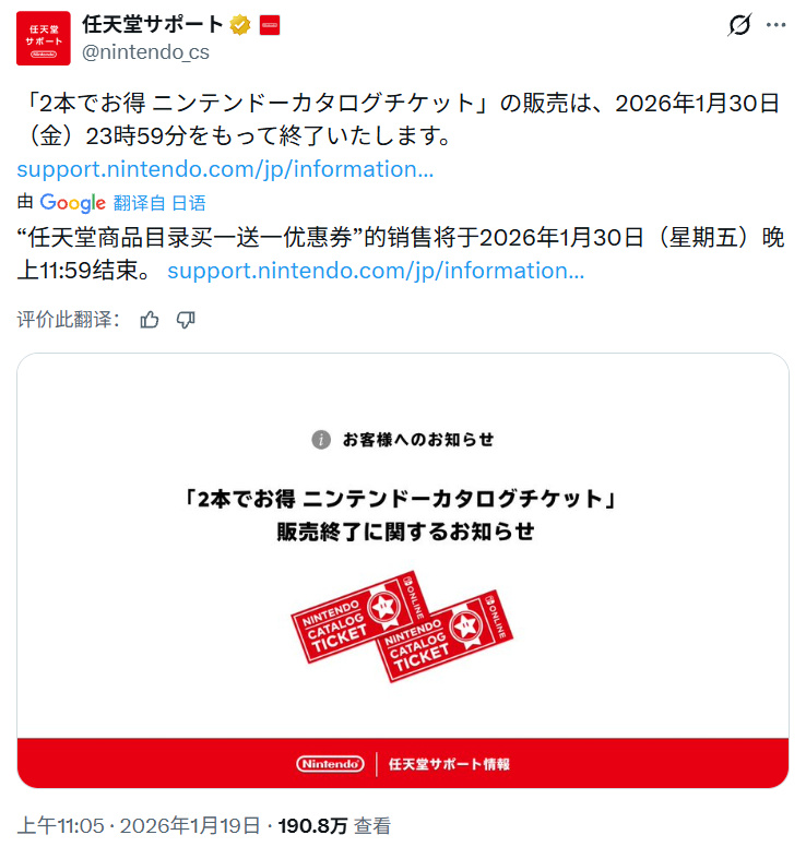 竞核1月19日消息,任亏券将于1月底停售:今日,任天堂官方发布提醒,旗下“任亏券”(任天堂游戏兑换券)的销售将于日本时间2026年1月30日(周五)23时59分正式结束,官方暂未提及后续是否开启类似优惠措施。