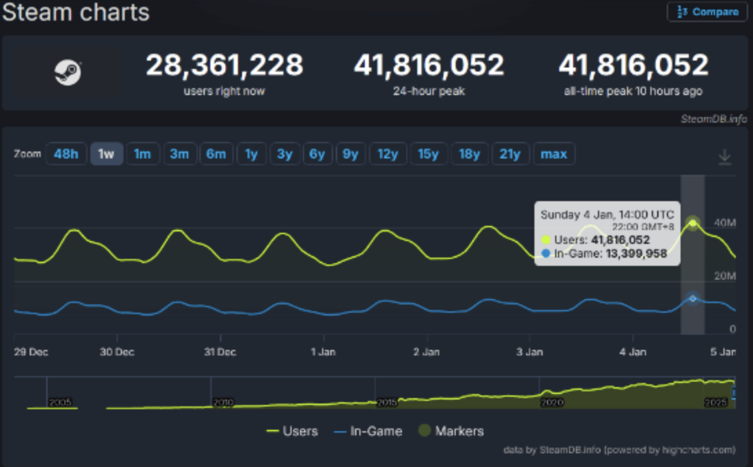 竞核1月5日消息,steam在线玩家峰值再破记录:2026 年伊始,Steam 平台在线玩家峰值再破纪录。据 SteamDB 数据,平台近 24 小时同时在线峰值达 4181.6 万,其中游戏内在线用户 1340 万,距离 4200 万大关仅一步之遥。