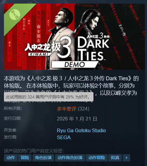 竞核1月22日消息,如龙新作demo口碑崩盘:备受关注的《如龙 极3 & DarkTies》(Yakuza Kiwami 3 & Dark Ties)试玩版近日正式登陆Steam,不过,仅上线一天,该Demo迎来了史无前例的口碑大崩盘。