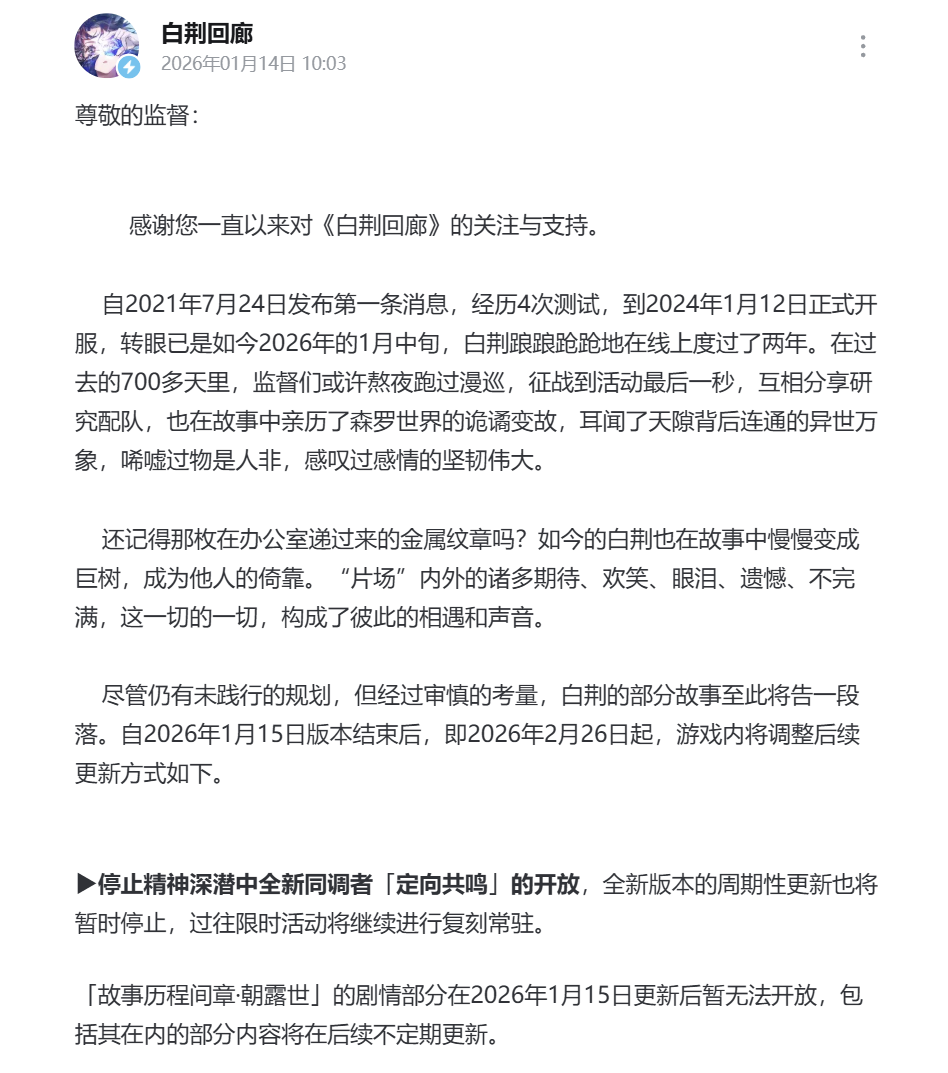 竞核1月14日消息,白荆回廊宣布停更:网元圣唐旗下上海烛龙自主研发,腾讯发行的二次元游戏《白荆回廊》今日官宣停更。公告显示,游戏将从2026年1月15日版本结束后,即2026年2月26日起,停止全新版本的周期性更新。据报道,2024年腾讯投资了北京网元圣唐,交易完成后腾讯持股比例达87.36%,成为网元圣唐的第一大股东,后续参与公司经营决策。企查查显示,网元圣唐法定代表人是裘雪颖,她也是腾讯国内发行线V6产品部(国潮)负责人。