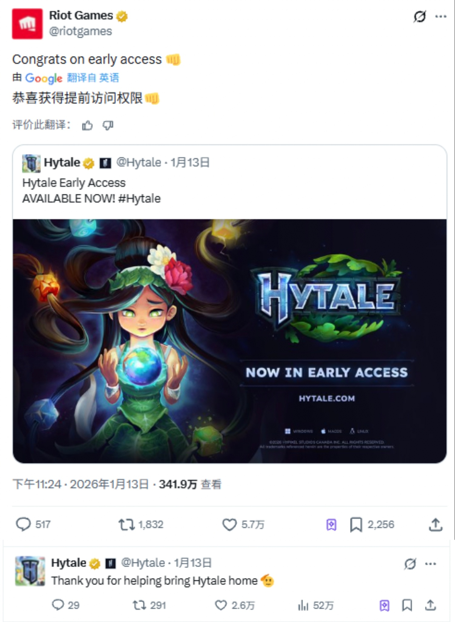 拳头发文祝贺Hytale开启抢先体验