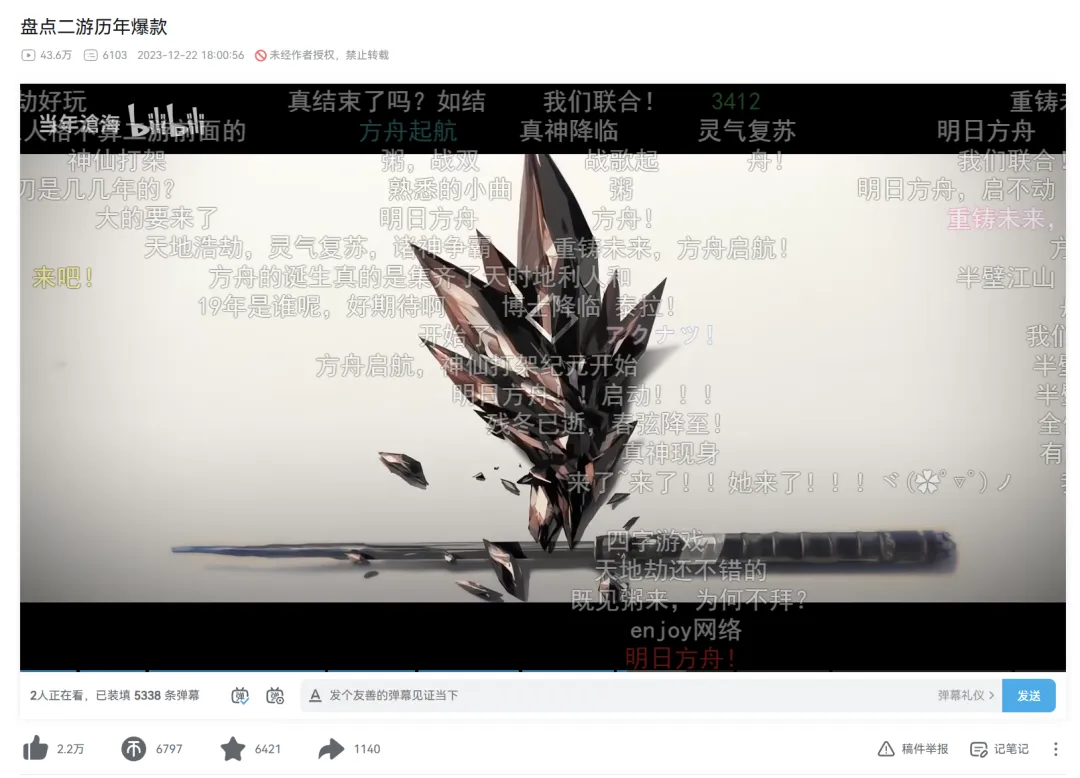 又像是《绝地潜兵》的“上海保卫战”,以及《明日方舟》的“蟑螂圣经”……B站有太多例子了。在B站,游戏不只是被“玩”的,更是被“谈论”“二创”以及“解构”的,这种有趣味性有活力的社区舆论场,才能让游戏长久地维持生命力。