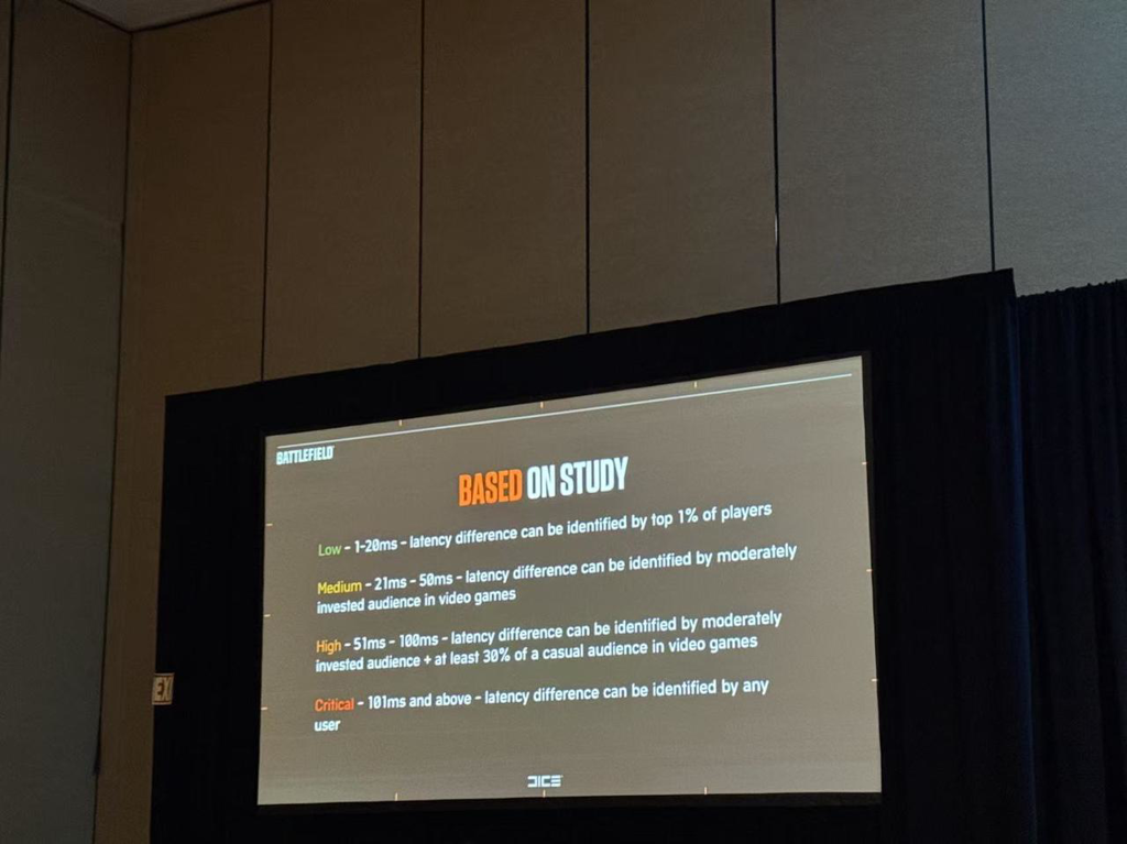针对此,他在GDC现场还展示了一则不同延迟水平的可感知性的具体数据:低延迟(1-20毫秒),仅能被顶尖1%的玩家察觉;中等延迟(21-50毫秒),能被中度投入的玩家察觉;高延迟(51-100毫秒),能被中度投入,玩家及至少30%的休闲玩家察觉;严重延迟(101毫秒以上),能被任何用户察觉。