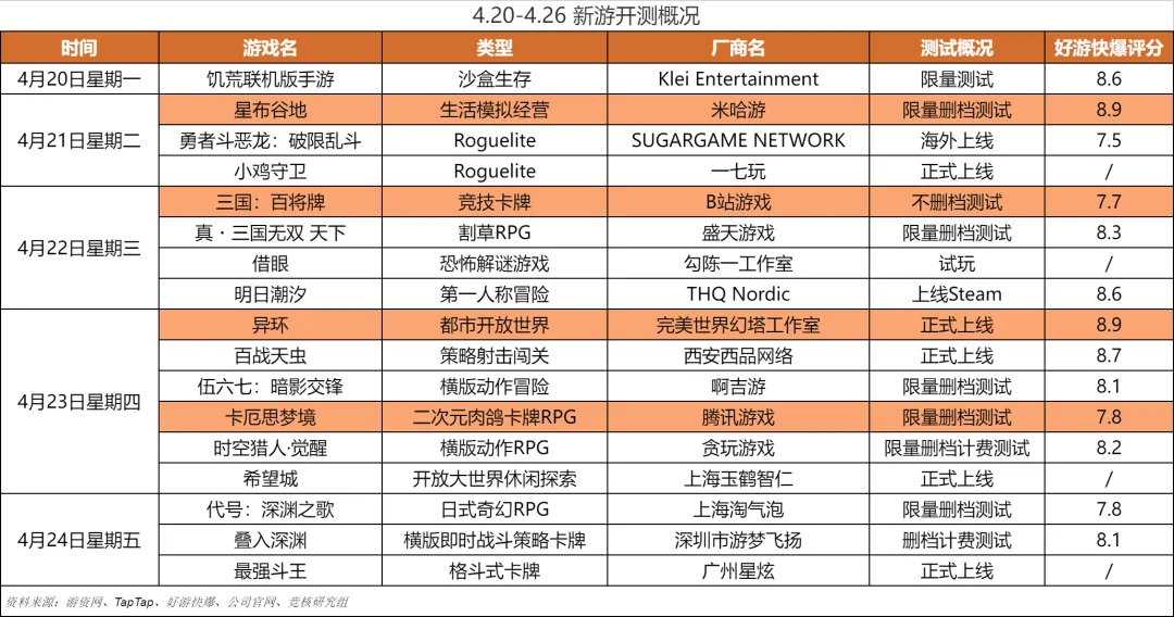可以说,下周在都市开放世界、生活模拟经营、休闲竞技卡牌、二次元肉鸽卡牌等热门赛道,均将迎来大厂新作。考虑到同周期内,还有米哈游《崩坏:星穹铁道》、网易游戏《燕云十六声》、叠纸《无限暖暖》、腾讯《三角洲行动》等热门产品新节点,整个市场热度、竞争强度或许会很高。