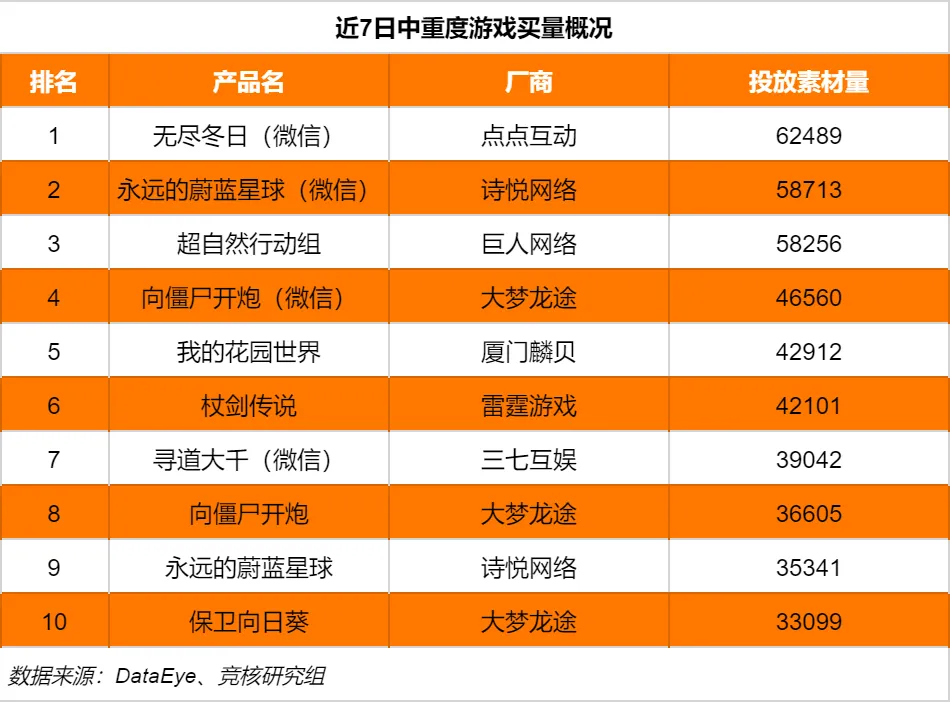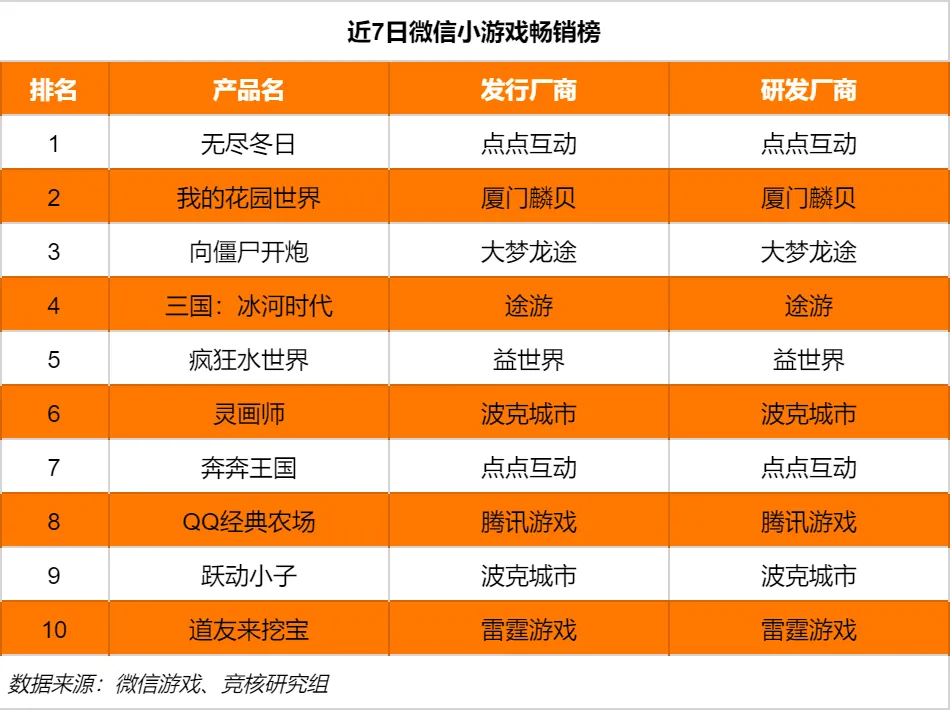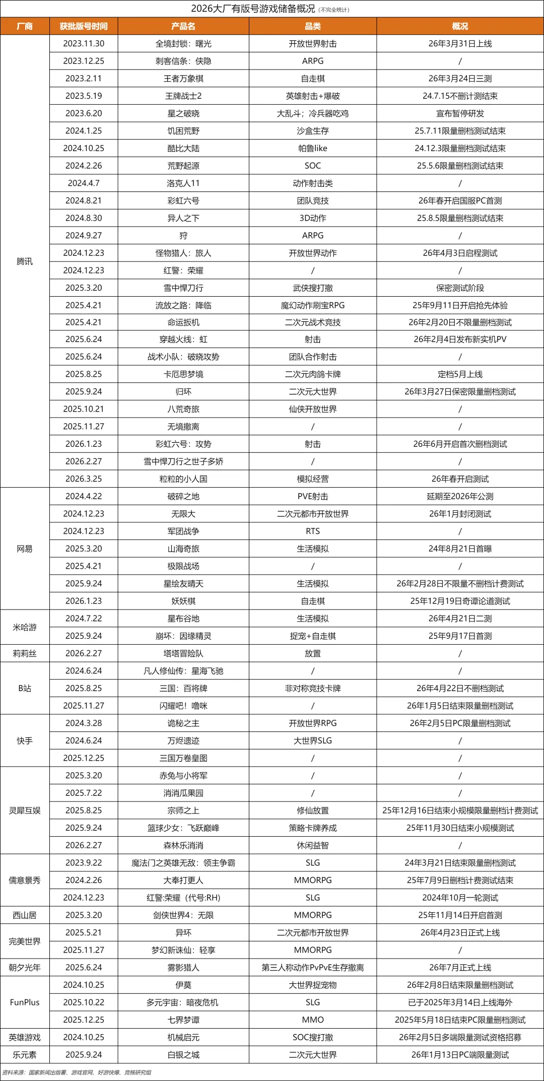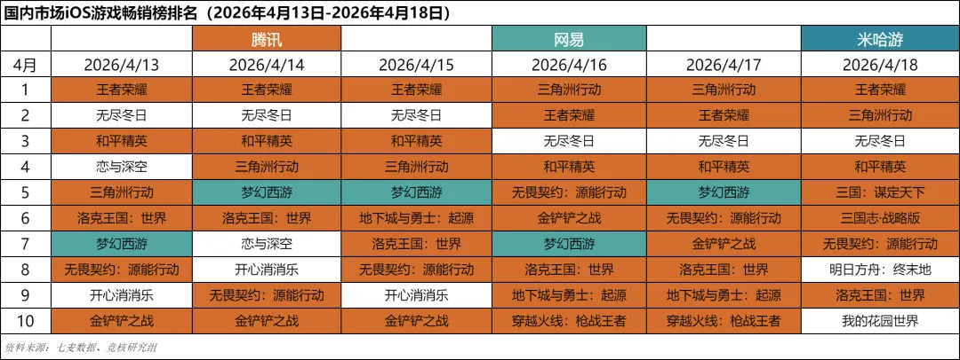 中国大陆市场2026年4月13日-2026年4月18日iOS游戏类畅销榜,Top10名单略有变化,但腾讯游戏整体仍保持较高声量。 聚焦iOS移动市场,本周腾讯旗下多款射击游戏开启新版本/新运营活动,这推动了《三角洲行动》《穿越火线:枪战王者》《和平精英》《无畏契约:源能行动》等的稳定发挥。其中,天美J3《三角洲行动》开启S9全新赛季,在新干员、新赛季任务、新皮肤等运营内容的助力下,游戏再一次冲上国区App Store游戏畅销榜以及畅销总榜Top1。 魔方旗下捉宠大世界新作《洛克王国:世界》保持稳定的表现。腾讯游戏发行的MMOARPG手游《地下城与勇士:起源》于4月15日推出新职业【小魔女】、【战斗法师】后,游戏闯入畅销榜Top10内。 其他厂商方面,叠纸《恋与深空》在4月13日开启秦彻生日主题活动开启,推出生日五星思念「秦彻·肆雨照夜」,推动游戏登上畅销榜Top4。4月17日鹰角《明日方舟:终末地》开启「春晓时」新版本,在新干员、焕新月卡赠礼等新运营内容的加持下,游戏周期性回升至畅销榜前十,登上Top4。 在SLG赛道,期内B站游戏《三国:谋定天下》全新赛季「陈仓之围」开启,灵犀互娱《三国志·战略版》新剧本“九州兵兴”上线。在新内容的驱动下,两款SLG经典大作均进入了畅销榜Top10。4月15日网易《率土之滨》玩法「三英战吕布」上线,游戏市场表现周期性回暖。此外,恺英网络新上线的《三国:天下归心》,截至发稿前畅销榜最高冲到了Top34。 中国香港市场 中国香港市场2026年4月13日-2026年4月18日iOS游戏类畅销榜中,点点互动《Kingshot》《寒霜启示录》、灵犀互娱《三国志·战略版》《信长之野望 真战》、叠纸《恋与深空》、网易游戏《燕云十六声》、柠檬微趣《Gossip Harbor》、鹰角网络《明日方舟:终末地》等进入前十。 中国台湾市场 中国台湾市场2026年4月13日-2026年4月18日iOS游戏类畅销榜中,进入Top10的大陆厂商游戏有点点互动《Kingshot》《寒霜启示录》、灵犀互娱《信长之野望 真战》/柠檬微趣《Gossip Harbor》、望尘科技《NBA巅峰对决》、鹰角网络《明日方舟:终末地》以及腾讯游戏《传说对决》等。 2.2 海外主要市场游戏榜单情况 美国市场 美国市场2026年4月13日-2026年4月18日iOS游戏类畅销榜中,柠檬微趣《Gossip Harbor》、点点互动《寒霜启示录》《Kingshot》等产品进入畅销榜Top10。 日本市场 日本市场2026年4月13日-2026年4月18日iOS游戏类畅销榜中,鹰角网络《明日方舟》、灵犀互娱《三国志·战略版》登顶。此外,柠檬微趣《Gossip Harbor》、三七互娱《Puzzles & Survival》、鹰角网络《明日方舟:终末地》、乐元素《偶像梦幻祭》、米哈游《绝区零》等产品有着不错表现。 韩国市场 韩国市场2026年4月13日-2026年4月18日iOS游戏类畅销榜中,点点互动《寒霜启示录》冲上畅销榜Top1。鹰角网络《明日方舟》、点点互动《Kingshot》、柠檬微趣《Gossip Harbor》等位列榜单前十。 印度市场 印度市场2026年4月13日-2026年4月18日iOS游戏类畅销榜中,点点互动《Kingshot》《寒霜启示录》等产品进入畅销榜Top10。 4月19日,根据微信近七天小游戏畅销榜显示,前十基本还是老熟人,包括点点互动《无尽冬日》、厦门麟贝《我的花园世界》以及大梦龙途《向僵尸开炮》等。 据DataEye数据显示,点点互动《无尽冬日》抢跑买量市场,本周该作投放素材量约62489组。此外,诗悦网络《我的蔚蓝星球》、巨人网络《超自然行动组》、厦门麟贝《我的花园世界》等多轻量化游戏,依旧保持着较高的买量投入。 据竞核不完全统计,截至4月19日,2026年共计下发游戏版号467个,其中国产游戏453个,进口游戏版号14个。 据竞核不完全统计,2026年大厂有版号游戏储备概况如上图,腾讯大约有26款,包括《王者万象棋》《异人之下》《命运扳机》《穿越火线:虹》等,拿到进口版号的《彩虹六号:攻势》宣布将于6月开启首次删档测试。网易方面大约有7款,包括《无限大》《山海奇旅》《星绘友晴天》等。 此外,米哈游、完美世界各有2款,B站、快手、儒意景秀各有3款,灵犀互娱有5款,莉莉丝、FunPlus、英雄游戏等也有1到3款有版号的在研项目。 产品上新方面,截至4月19日,腾讯游戏2026年已经推出4款新游,其中天美J3研发的PvE射击《逆战:未来》和魔方工作室研发的捉宠大世界《洛克王国:世界》最高登顶了国区iOS畅销榜Top1。 鹰角网络《明日方舟:终末地》自上线以来,长期稳定在畅销榜Top50内,最高登上Top4。此外,金山世游推出的派对游戏《鹅鸭杀手游》近期有着不错的表现,最高畅销榜排名来到了Top9。 面向游戏投资领域,本周全新消息传出。