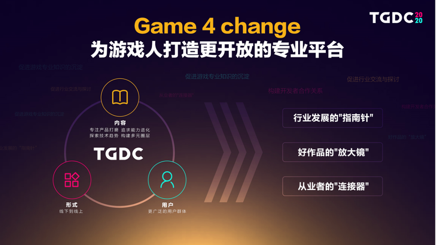 所以,我们将今年TGDC的主题定为Game 4 Change,就是期望通过专注产品打磨、追求能力进化、探索技术趋势、构建多元圈层四个维度,与从业者一起直面当下的机遇与挑战。并通过全新的线上形式,让更多的从业者、专业人士与游戏爱好者能参与其中。