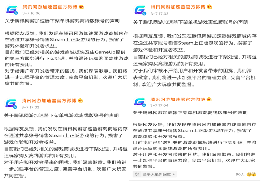 而后通过查询编辑记录,我们发现微博现在的这版公告并非“原版”。腾讯前后共四次修改该微博,而最初的原始版本,正是与迅游加速器官网一致。