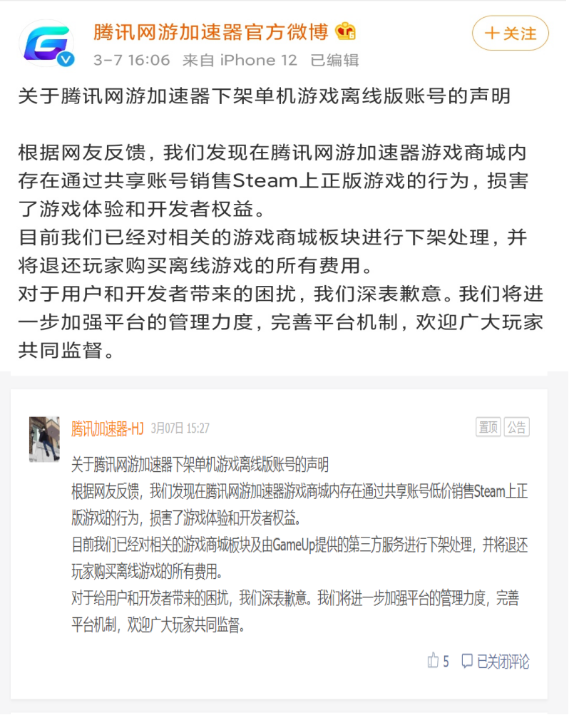 文中指出,“目前我们已对相关游戏商城板块及由GameUp提供的第三方服务进行下架处理,并将退还玩家购买离线游戏的所有费用。”这是微博没有提及的。