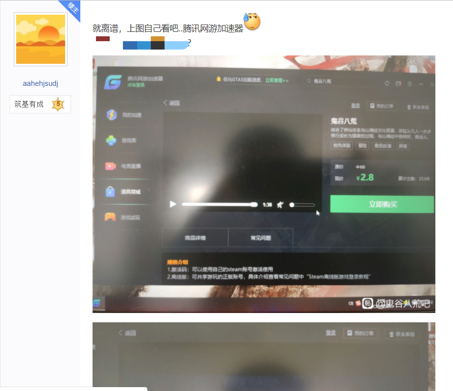 竞核查询到,早在3月4日就有玩家发现腾讯网游加速器上的“鬼谷八荒离线版”。3月4日12时,鬼谷八荒吧吧友“aahehjsudj”发布名为“腾讯卖盗版鬼谷八荒”帖子,文中张贴四张图片,皆是实拍。