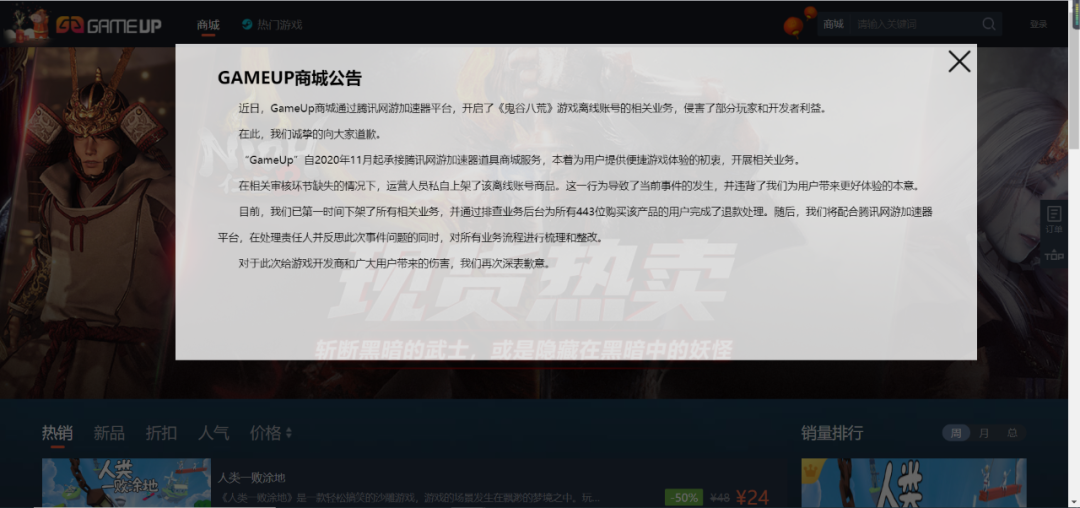 抽丝剥茧,竞核又找向GameUp。在该公司网站首页,自动弹出了道歉公告,表示本次事件是由于“相关审核环节缺失的情况下,运营人员私自上架了离线账号商品”。