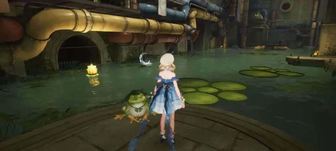 不一样的是,主线的跳跃副本成为了剧情内容的一种表现形式。就比如“福鸣之井”,因为剧情设定是青蛙的求助,地图场景就设计成了它们的栖息地。又因为是井,跳跃平台就要不同于外面世界的常规平台,变成了荷叶 ,梦露鱼的泡泡攻击也完美融合背景故事。