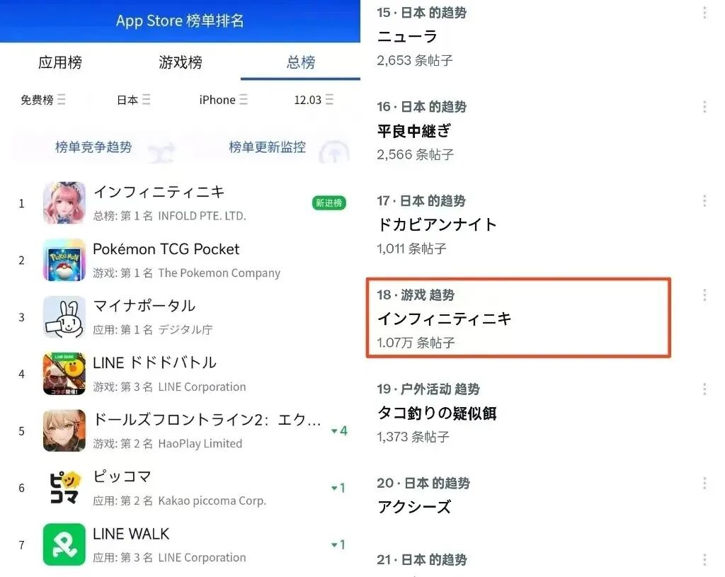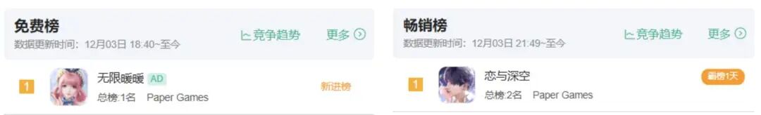 《无限暖暖》和《恋与深空》同时登顶,前者是今天12:00刚开启预下载的开放世界,后者是昨天开启新活动的乙女游戏,都是叠纸2024年拿出的新品。
