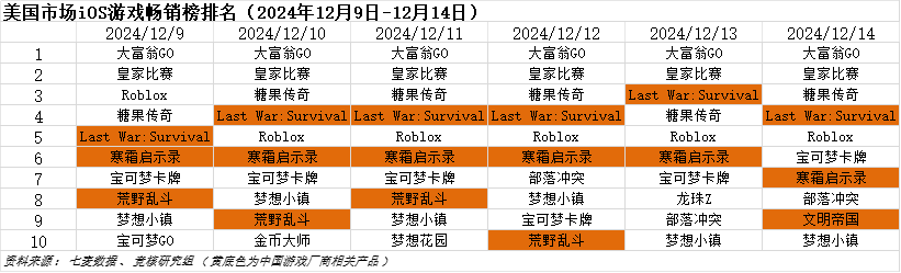 美国市场2024年12月9日—2024年12月14日iOS游戏类畅销榜中,元趣娱乐《Last War:Survival》,点点互动《寒霜启示录》,腾讯《荒野乱斗》,TOP GAMES《文明帝国》进入畅销榜前十。