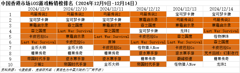 中国香港市场2024年12月9日—2024年12月14日iOS游戏类畅销榜中,海彼游戏《弓箭传说2》持续发力,在本周霸榜4天,《宝可梦卡牌(宝可梦TCG Pocket)》在本周表现依旧强势,霸榜2天。