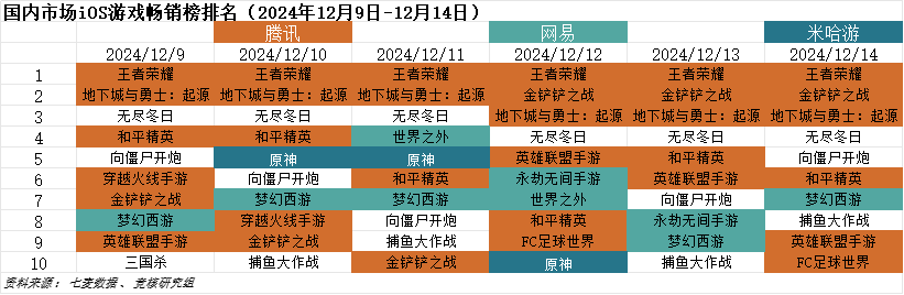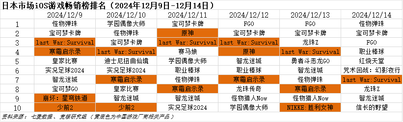 日本市场2024年12月9日—2024年12月14日iOS游戏类畅销榜中,元趣娱乐《Last War:Survival》,点点互动《寒霜启示录》,米哈游《原神》、《崩坏:星穹铁道》,腾讯《NIKKE:胜利女神》、散爆《少前2》在本周进入畅销榜前十。