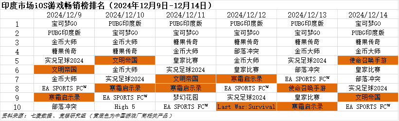 印度市场2024年12月9日—2024年12月14日iOS游戏类畅销榜中,点点互动《寒霜启示录》、TOP GAMES《文明帝国》、元趣娱乐《Last War:Survival》、腾讯《使命召唤手游》进入畅销榜前十。