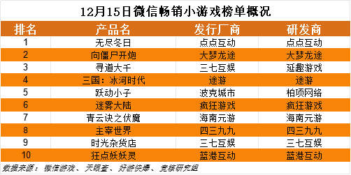 12月15日微信畅销小游戏前十榜单中,除点点互动的《无尽冬日》等常见面孔外,本周有了新面孔蓝港互动《狂点妖妖灵》。在玩法上,《狂点妖妖灵》采用了青云诀like的数值养成玩法,在商业化上也采用了去年年末流行的0.1折模式。
