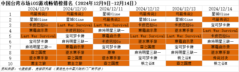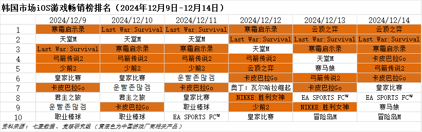 韩国市场2024年12月9日—2024年12月14日iOS游戏类畅销榜中,元趣娱乐《Last War:Survival》、腾讯《云顶之弈》、点点互动《寒霜启示录》分别登顶2天。