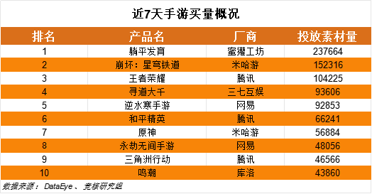 据DataEye数据显示,近7天国内游戏买量榜单中,蜜獾工坊《躺平发育》一骑绝尘,维持较大的买量力度。此外腾讯、网易和米哈游旗下的旗舰产品仍保持高素材量投放,买量广告基本成为其常态化营销手段,并且均已字节系渠道为主。
