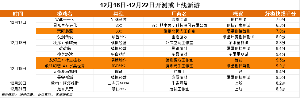 下周(12月16日-12月22日)开测新游: