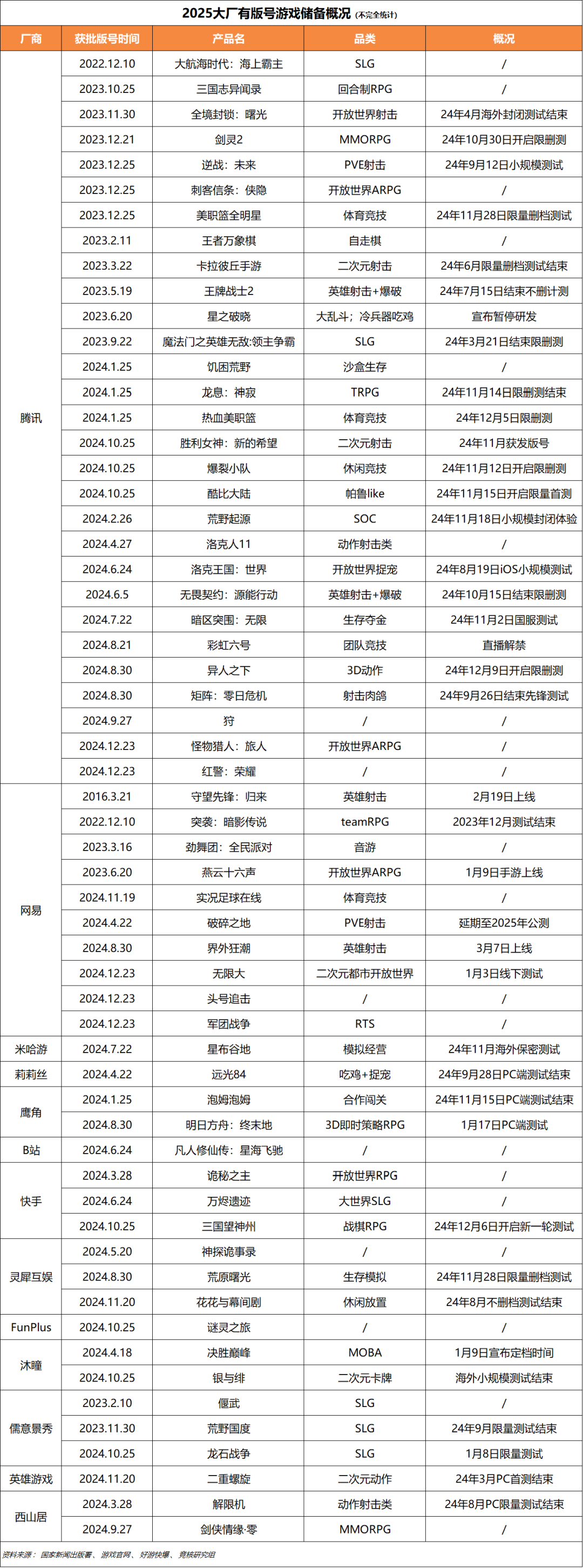 据竞核不完全统计,2024大厂有版号游戏储备概况如上图,腾讯大约有29款。其中《胜利女神:新的希望》《爆裂小队》两款重点引进产品中,《爆裂小队》刚刚于12月30日结束新一轮测试,《胜利女神:NIKKE》则有望在Q1进行测试,预计两款产品将在今年上半年上线。