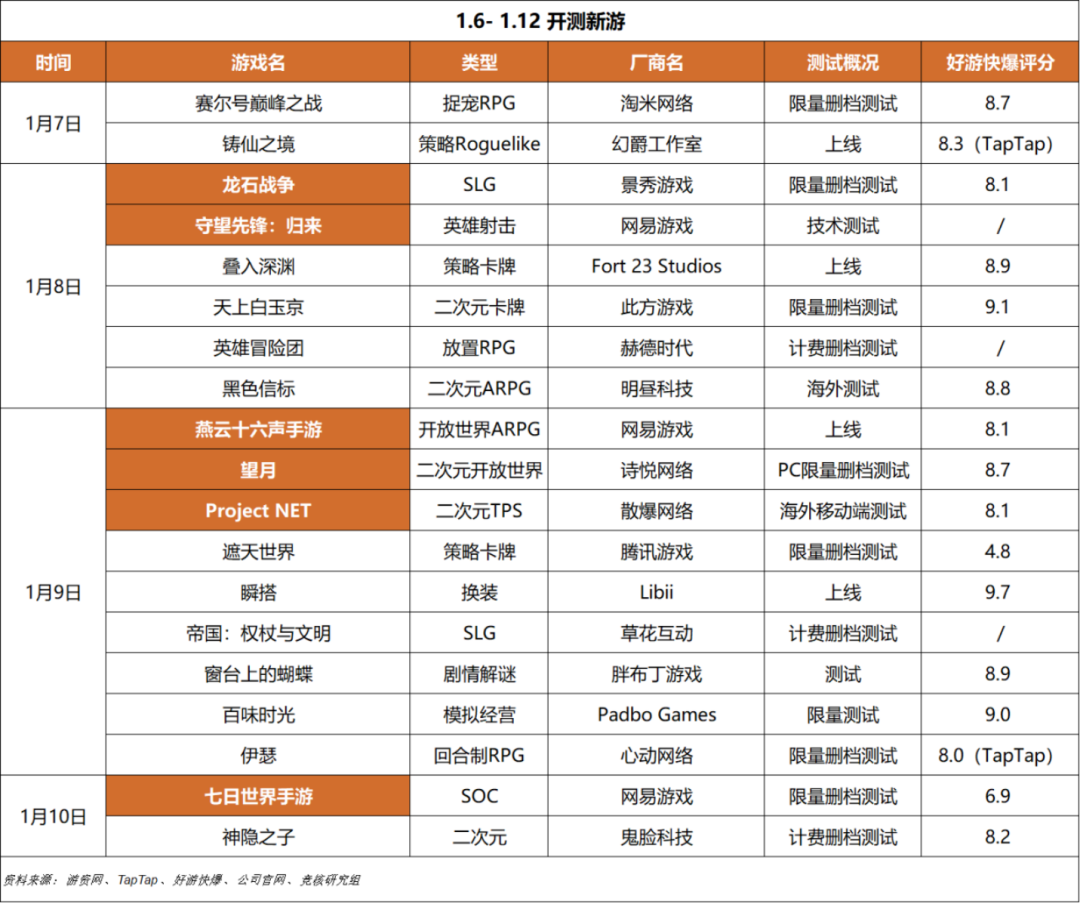下周(1月6日-1月12日)开测新游: