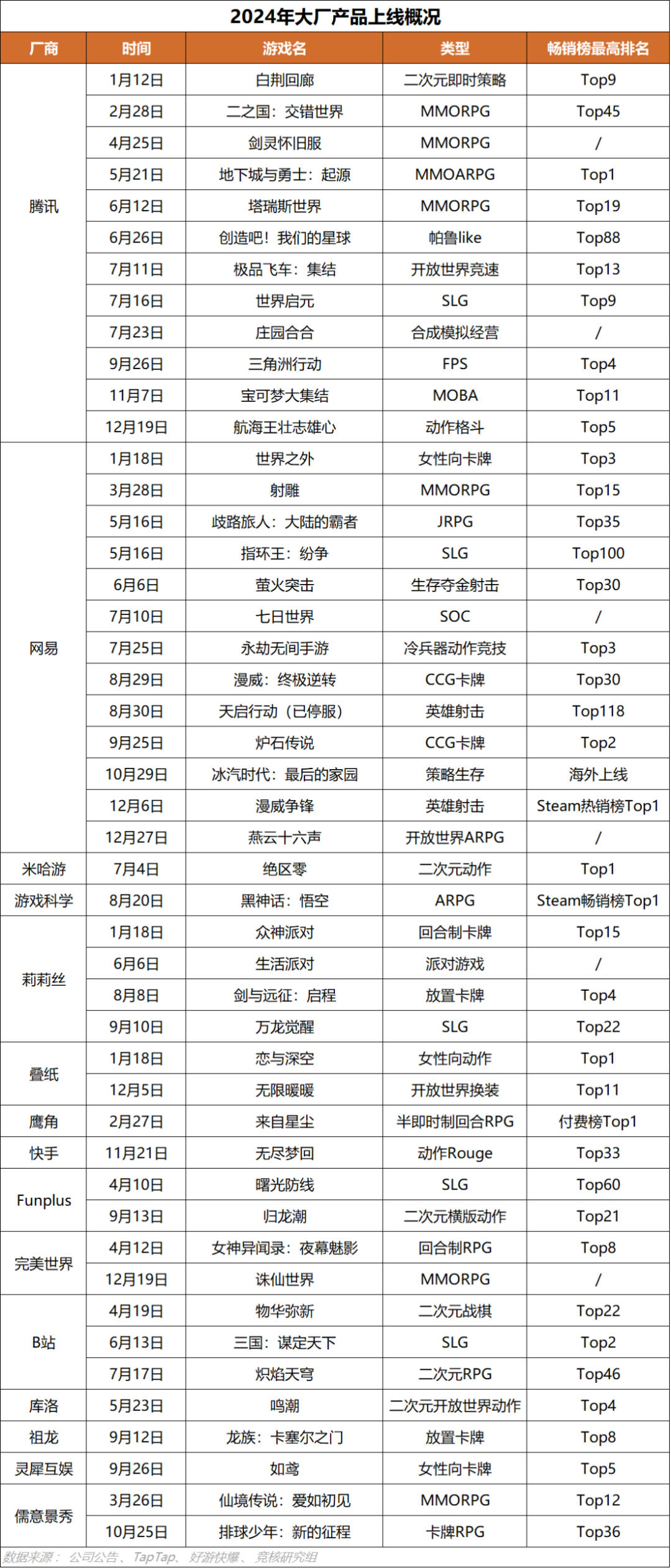 产品上新方面,2024年去年腾讯、网易分别上线了11款、12款产品(不包含怀旧服和海外产品),莉莉丝有4款产品上线,B站有3款,叠纸、FunPlus、完美世界、儒意景秀有2款,米哈游、游戏科学、鹰角、库洛游戏、祖龙娱乐、灵犀互娱也都有一款新作上线。