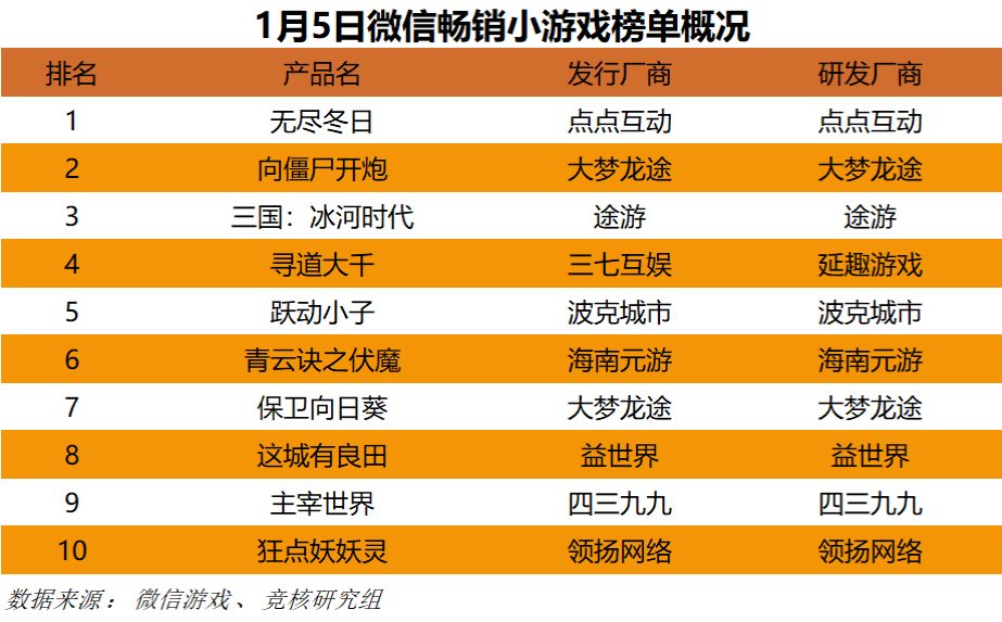 1月5日微信畅销小游戏榜单中,较为值得关注的新品还是12月上升较为明显的两款产品领扬网络《狂点妖妖灵》和大梦龙途《保卫向日葵》。