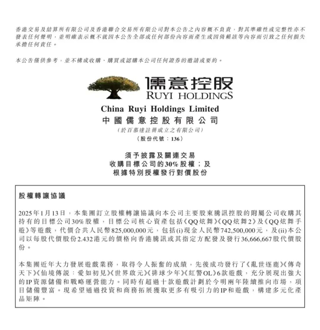 公告显示,集团订立股权转让协议向公司主要股东腾讯控股的附属公司收购其持有的目标公司北京永航科技有限公司30%股权,目标公司核心资产包括《QQ炫舞》《QQ炫舞2》及《QQ炫舞手游》等游戏,代价合共人民币8.25亿元。