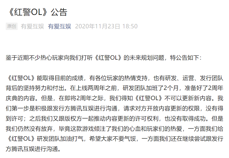 有爱互娱最早是在2020年9月跟字节联系起来的,但字节的投资收购一度让《红警OL》的更新陷入窘境。主要是因为发行方腾讯通知其不得更新,而有爱互娱跟版权方一起推动内容更新许可的操作也未取得成功。