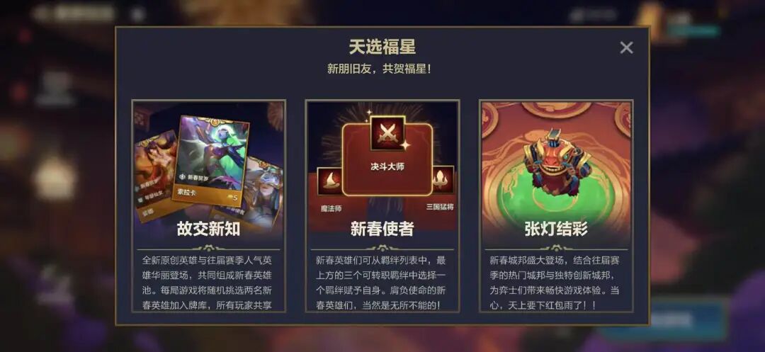 比如这个春节期间的“天选福星”就融合了S4.5和S8的主题玩法,既有天选也有海克斯。就笔者的“身边统计学”来看,这个春节游玩“天选福星”的人数基本要多于“双城传说2”。