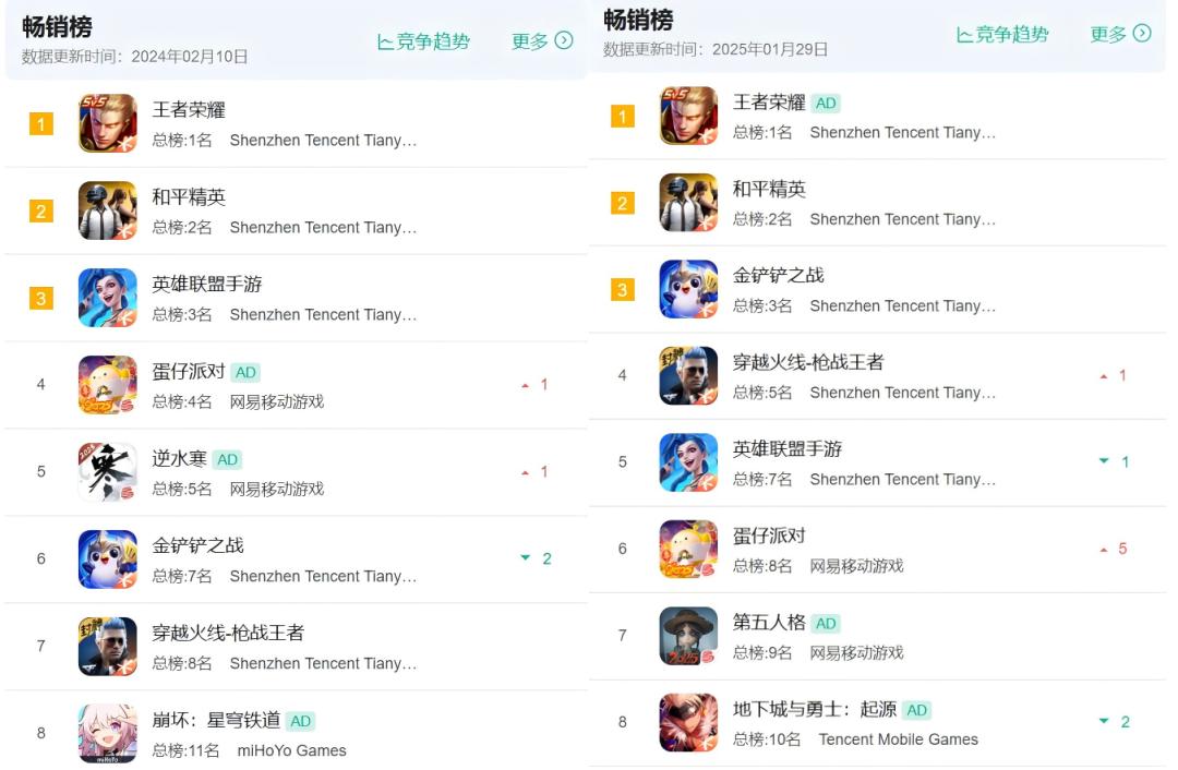 从榜单表现上也能看出《金铲铲之战》在这个春节档期的抢眼表现,自除夕开始,《金铲铲之战》近半个月一直保持在畅销榜第三的位置,仅次于《王者荣耀》与《和平精英》。相较之下,龙年春节《金铲铲之战》的名次大概一直在5-8名之间,增长十分明显。