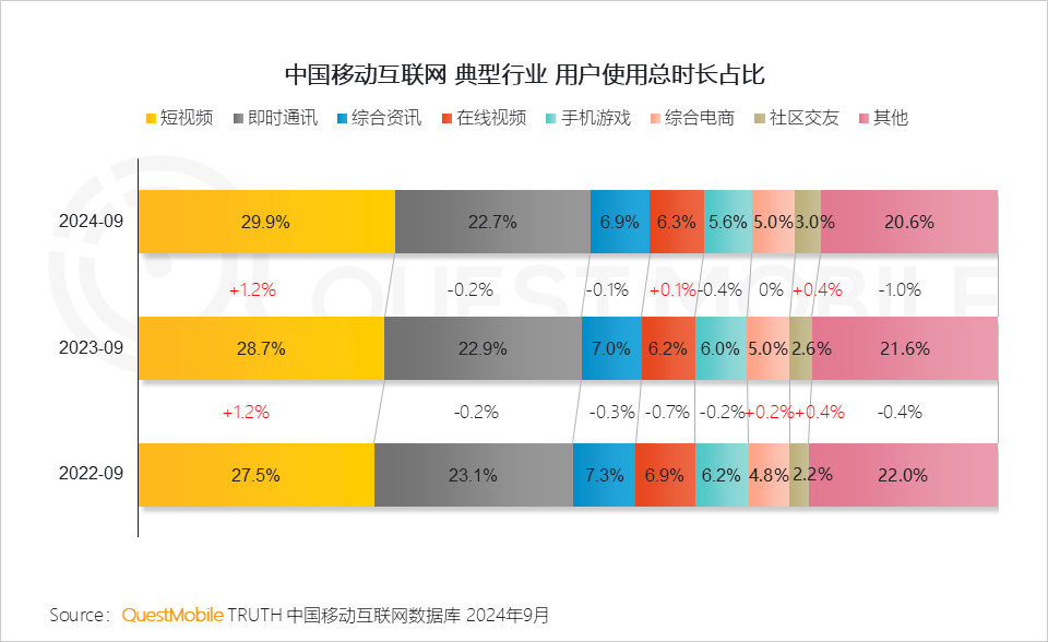 QuestMobile去年发布的报告中,移动互联网的用户使用总时长中,短视频的比重就一直在持续升高,手游则连续三年出现下滑态势。