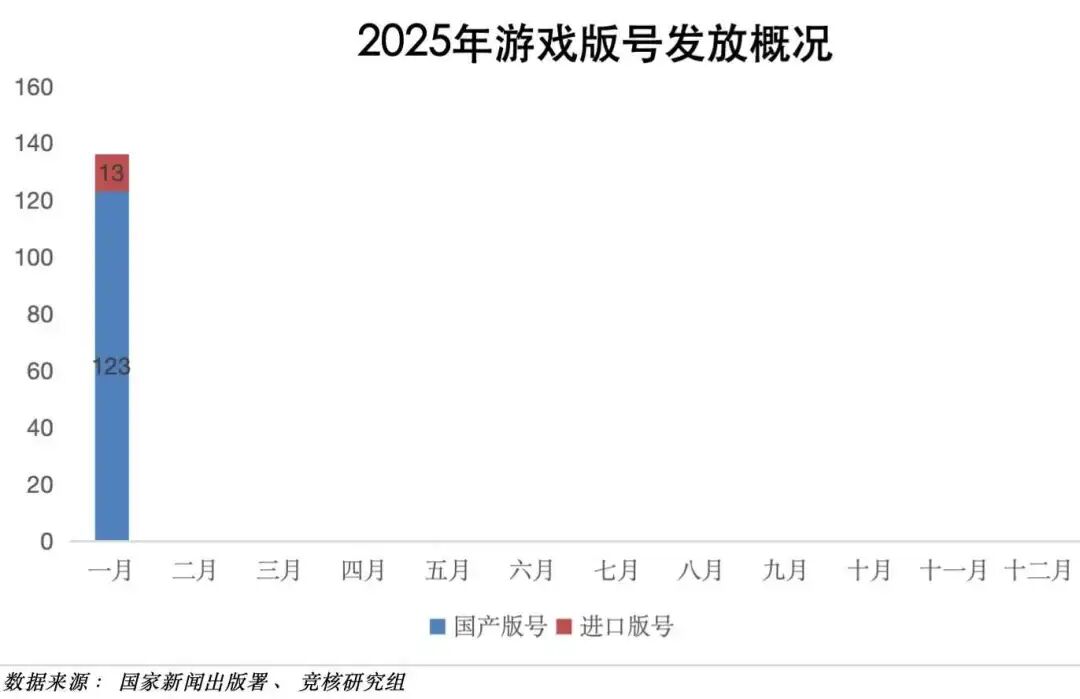 据竞核统计,截至2月16日,2025年国家新闻出版署共计发放了136款新游版号,其中包括123款国产游戏版号、13款进口游戏版号。