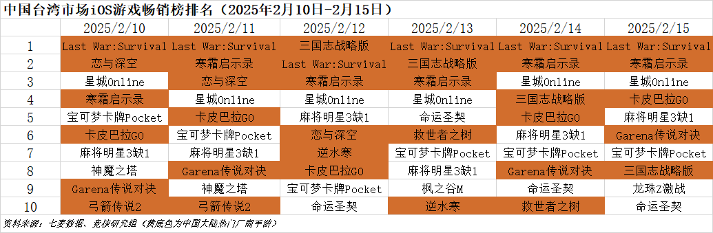 中国台湾市场2025年2月10日-2025年2月15日iOS游戏类畅销榜中,元趣科技《Last War:Survival》登顶5天,灵犀互娱《三国志战略版》登顶一天。