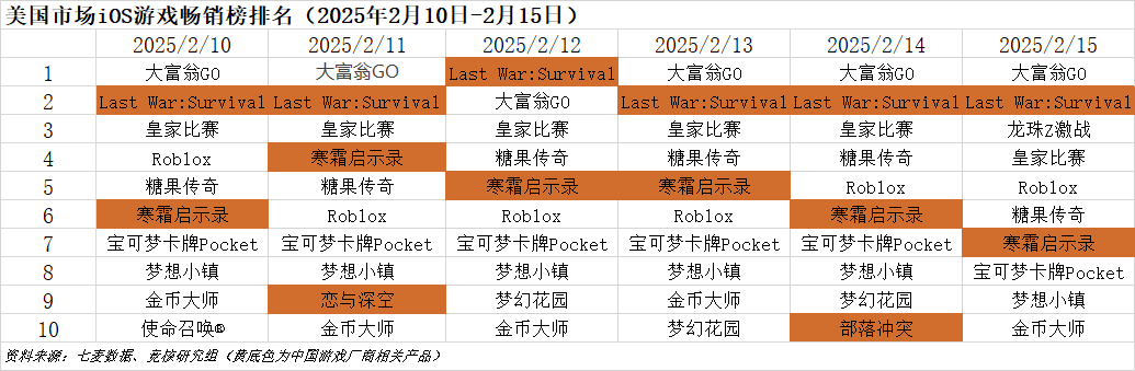 美国市场2025年2月10日-2025年2月15日iOS游戏类畅销榜中,元趣科技《Last War:Survival》登顶1天。点点互动《寒霜启示录》、叠纸《恋与深空》、腾讯游戏《部落冲突》手游等产品进入畅销榜Top10。