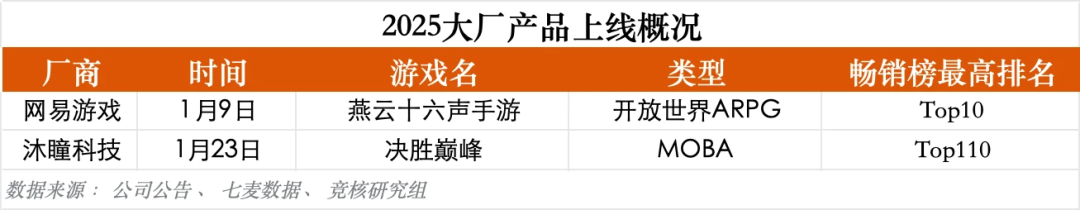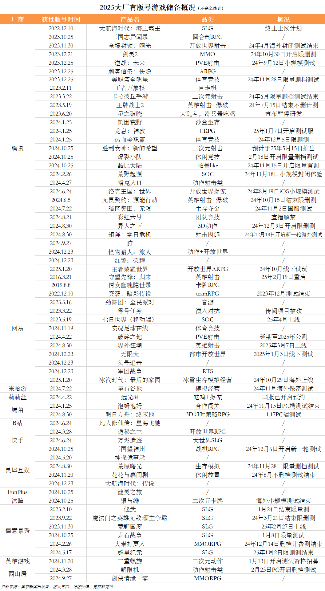 据竞核不完全统计,2025大厂有版号游戏储备概况如上图,腾讯大约有29款,包括《怪物猎人:旅人》《王者荣耀世界》《胜利女神:新的希望》《爆裂小队》等。网易方面大约有13款,包括《无限大》《界外狂潮》等。