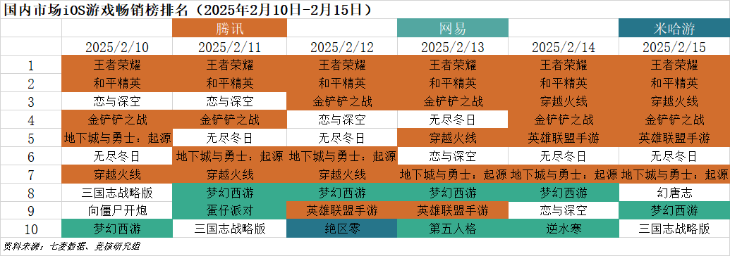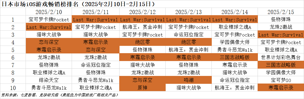 日本市场2025年2月10日-2025年2月15日iOS游戏类畅销榜中,元趣科技《Last War:Survival》登顶四天。叠纸《恋与深空》、点点互动《寒霜启示录》、米哈游《绝区零》《原神》、库洛《鸣潮》、灵犀互娱《三国志战略版》等产品有着不错表现。