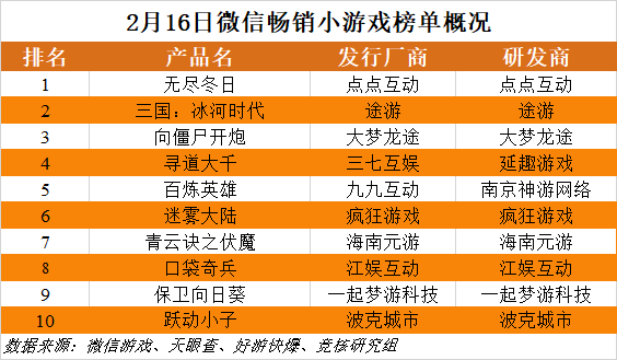 2月16日,微信畅销小游戏前十榜单中暂无新品进入,点点互动《无尽冬日》依旧领跑。