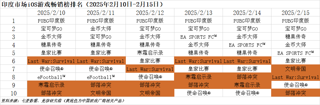 印度市场2025年2月10日-2025年2月15日iOS游戏类畅销榜中,元趣科技《Last War:Survival》、点点互动《寒霜启示录》、TOP GAMES《文明帝国》、腾讯游戏《部落冲突》手游等产品进入畅销榜Top10。