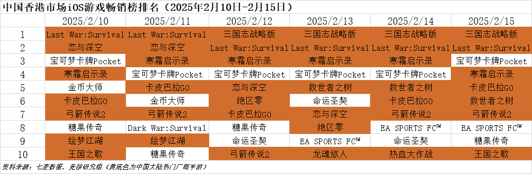 中国香港市场2025年2月10日-2025年2月15日iOS游戏类畅销榜中,元趣科技《Last War:Survival》登顶2天,灵犀互娱《三国志战略版》登顶4天。