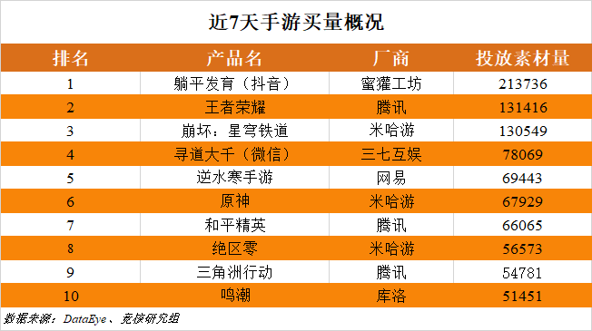 据DataEye数据显示,近7天的国内游戏买量榜单前十产品变动不大。小游戏类型产品有两款,分别是蜜獾工坊《躺平发育》和三七互娱《寻道大千》。除此之外,腾讯、网易和米哈游旗下的旗舰产品仍保持高素材量投放,买量广告基本成为其常态化营销手段。
