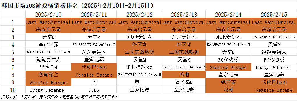 韩国市场2025年2月10日-2025年2月15日iOS游戏类畅销榜中,元趣科技《Last War:Survival》登顶6天。