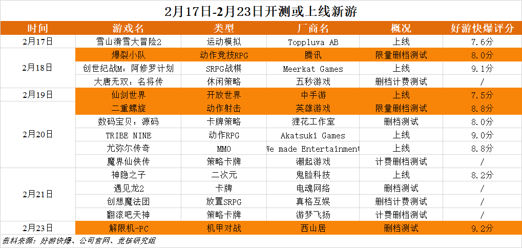 下周开测或上线的游戏厂商包括腾讯、中手游、英雄游戏、西山居等厂商。