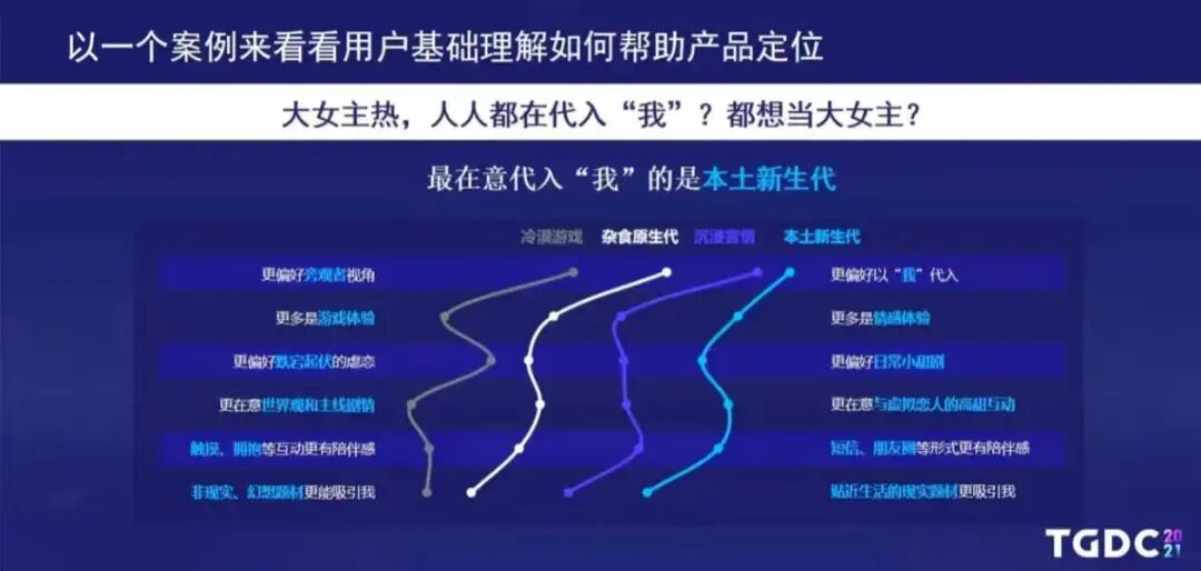 会上说:“其实真正以第一人称代入去消费的群体只有新发现的本土新生代群体,其他群体相对来讲在代入的视角都会比较理性,不一定以第一人称的方式与角色互动,可以在不同的角色角度去切换、感受故事。”