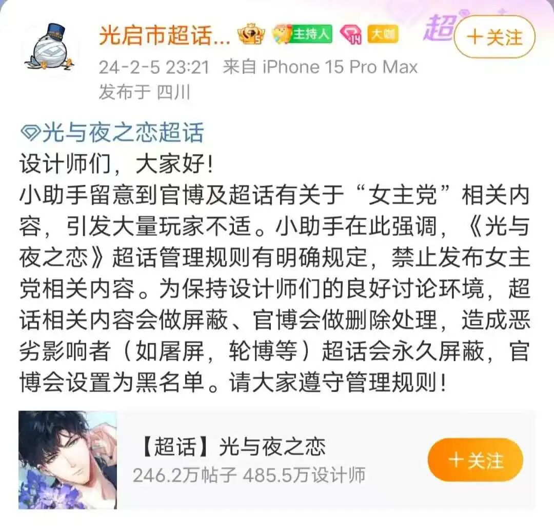 有人拿北极光自己的乙游产品《光与夜之恋》举例,这个21年公测的游戏,24年已经开始在超话里严打“女主党”,维护代入环境,无疑是站在了图中“本土新生代”一方,会上提到的“新生代群体占比只有五分之一”的数据或许也需要随着国乙的扩圈发展更新了
