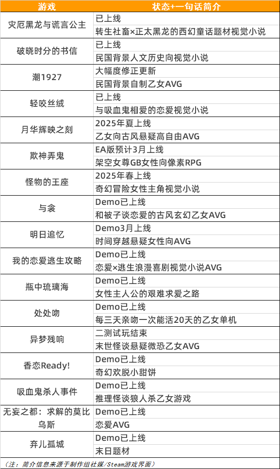 本着求实的态度,笔者对目前社媒/游戏社区里较为活跃的自制乙游进行了不完全统计,统计范围仅包括2025年新上线/即将上线/有Demo曝光的国区游戏。