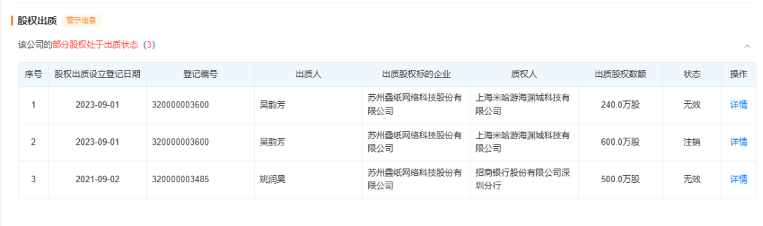 近日,根据天眼查显示,苏州叠纸网络科技有限公司在2023年9月1日向上海米哈游海渊城科技有限公司出质的股权登记已处于无效/注销状态。